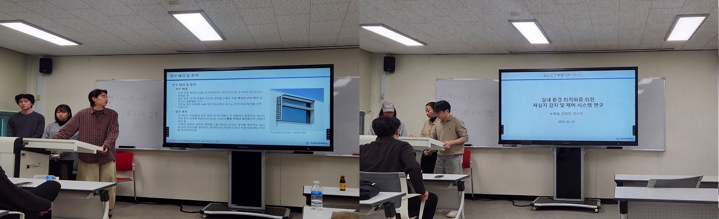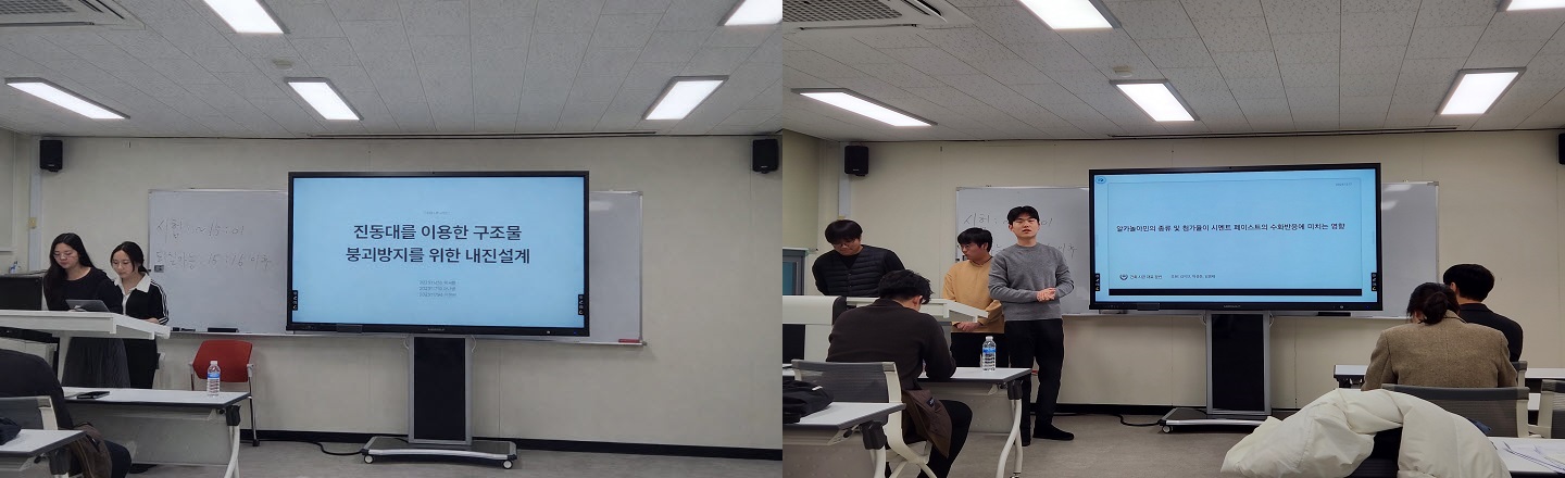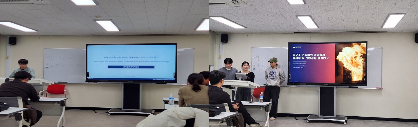 25.12.15.(월) 한 학기동안 고민하고 설계한 결과물을 직접 소개하는 2025학년도 캡스톤디자인 패널 발표회가 열렸습니다. 학생들이 각자의 아이디어와 노력을 담아 만든 설계 작품을 친구들과 교수님들 앞에서 발표를 진행했습니다. 서로의 작업에 대해 이야기 나누며 실전 감각도 쌓을 수 있는 좋은 시간이었습니다. 미래 건축인을 향한 학생들의 진지한 고민과 노력을 엿보고 건축공학도다운 열정, 그리고 유쾌한 에너지가 함께한 하루였습니다!